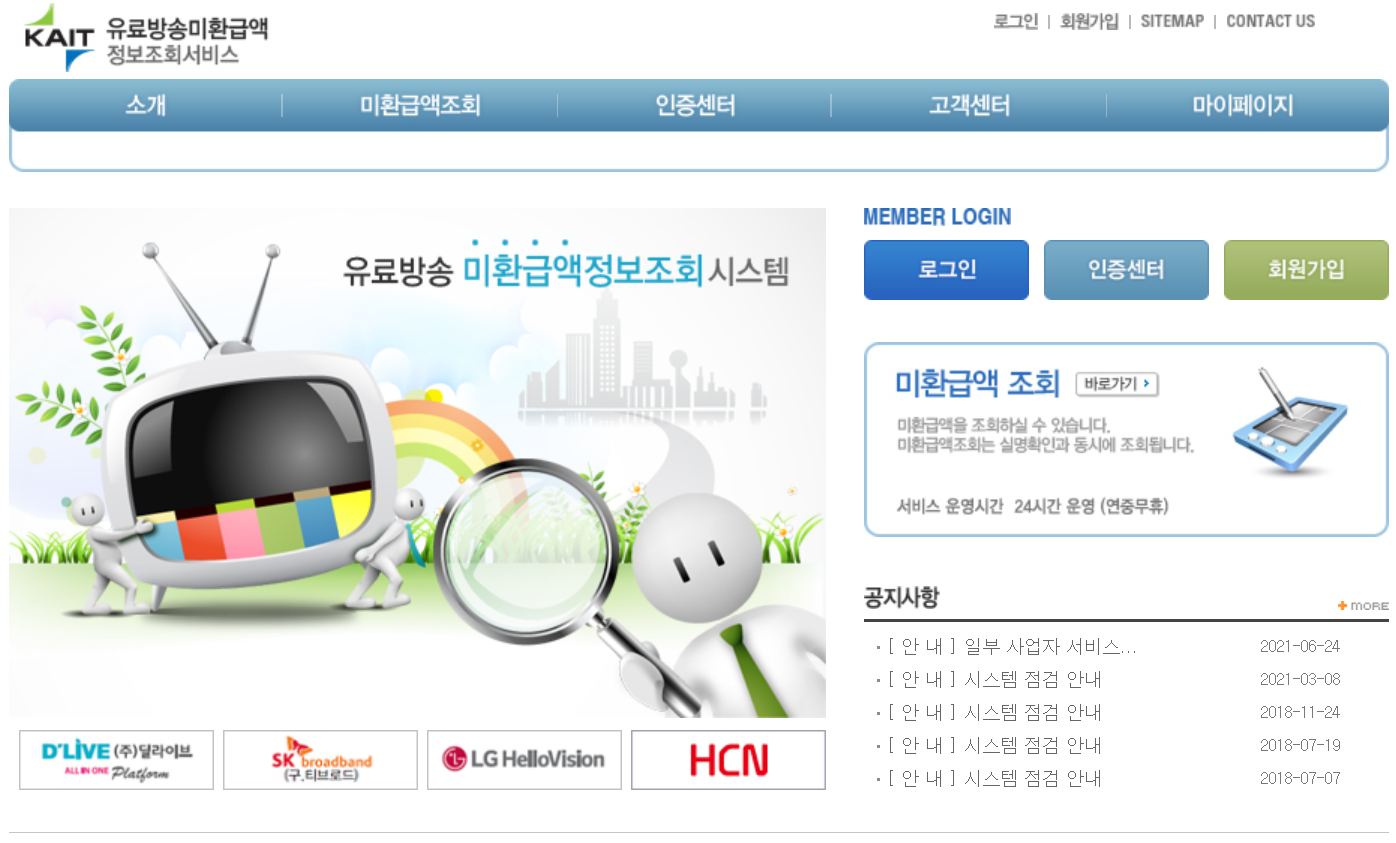 유료방송 서비스를 이용하셨던 적이 있으시다면 아래의 미환급금 조회를 통해 환급액을 확인할 수 있습니다.