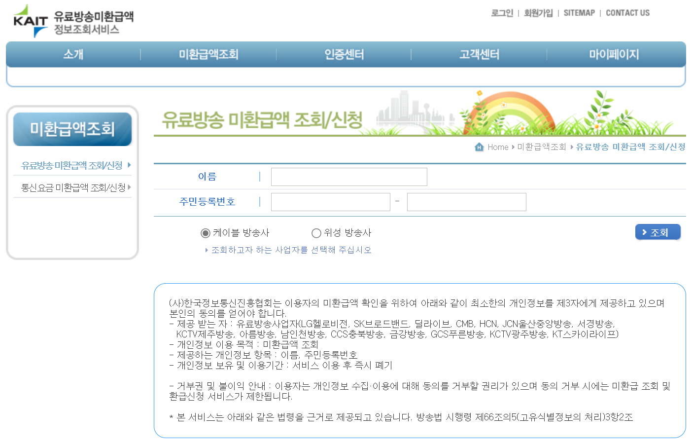 - 유료방송 미환급액 조회/신청에 이름과 주민등록번호를 등록합니다.